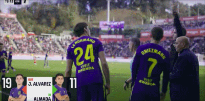 第77分钟,马竞换人调整,阿尔瓦雷斯被换下,格列兹曼登场